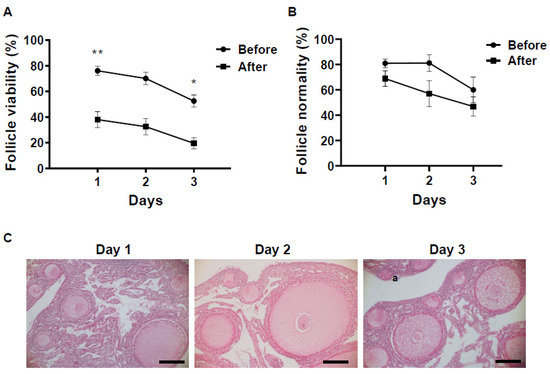 Each value shown is the mean with the standard error of mean (SEM). The Shapiro–Wilk test was used to determine if the dataset was normal. Additionally, the Bartlett test was used to evaluate the homogeneity of variance. Analysis of variance (ANOVA) followed by a Turkey’s multiple comparison test were applied to compare follicle viability and morphology, pH of storage medium and relative expression level of mRNA among different storage conditions or before/after vitrification. Differences were considered significant at a level of p < 0.05 (GraphPad PRISM 9, GraphPad Software, La Jolla, CA, USA).