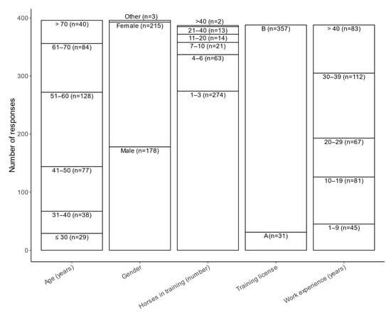 A majority of the respondents (63%, 252/396) were above 50 years of age, and most were amateur trainers (B license) with fewer than four horses in training (Figure 1). A majority of the trainers (75%, 290/387) only trained their own horses, 23% (88/387) trained both their own and others’ horses, and 2% (9/387) only trained others’ horses. Most of the respondents stated that they had the trotting horse business mainly as a hobby (64%, 253/391), while 10% (39/391) stated that the horse business was their only income. Only 6% (23/391) of the trainers had employees, while 94% (368/391) did not. Of the respondents, 71% (274/385) had their own premises, while 29% (111/385) shared stables with other trainers. Most trainers kept their horses in single boxes (92%, 355/385), 37% (143/385) kept horses loose-housed (i.e., in open barns), and only 1% (2/385) kept their horses tied in stalls. Most trainers (97%, 370/381) described conditions in their stable as good to very good. The trainers who completed the questionnaire really seemed to enjoy training horses, reporting a mean value of 9.48 on a scale from 1 (I certainly do not) to 10 (I certainly do).