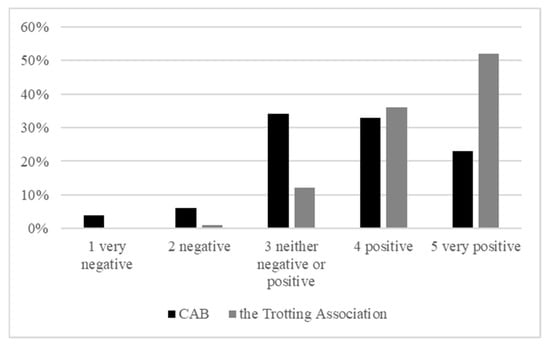 A majority of the trainers, 55% (165/303), agreed that the official CAB control is necessary in order to check that animal welfare on trotting horse premises is satisfactory. However, a greater proportion (85%, 221/258) viewed the STA inspections as necessary for animal welfare, and 89% (230/259) agreed with the statement that ‘I believe it is good that the Trotting Association makes inspections at my place’. The number of trainers agreeing with the same statement for CAB inspections was 61% (184/303).