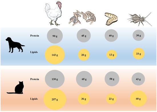Cricket meal has a higher protein concentration; therefore, a smaller daily portion, close to 33% of the portion of chicken meat, is required to cover the protein requirements of dogs and cats. The portion of chicken required to cover the required lipid needs in cats is 11 times higher than mealworm larvae meal.