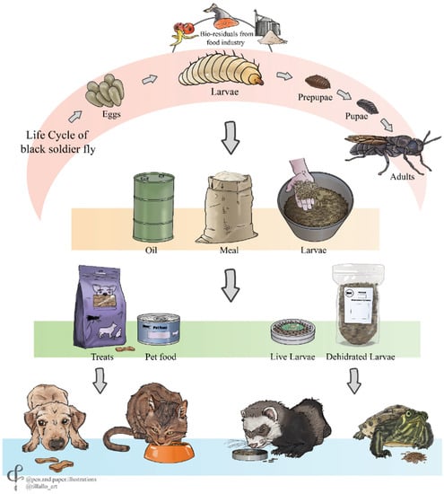 Larvae are fed with household wastes, agroindustrial wastes or to a lesser extent with animal or marine waste. They are then harvested and processed as live or dehydrated larvae, larval meal and/or fat []. The meal and fat are used as ingredients in the formulation of food (dry and wet) and treats for dogs and cats, while the live or dehydrated larvae are offered as a dietary supplement for exotic pets.