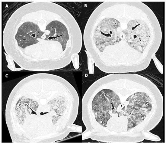 Severity categorization of pulmonary soft tissue attenuation (PSTA), assessed as an average reflecting both lungs, was scored as: absence of increased PSTA, mild: minimal focal, heterogeneous PSTA affecting <25% of the lungs, moderate: diffuse, heterogeneous, patchy PSTA, including focal homogeneous PSTA affecting 25–75% of the lung parenchyma, and severe: diffuse, homogeneous PSTA, affecting >75% of the lung parenchyma (Figure 3). Thereafter, distribution of PSTA changes of dorsal–ventral and left–right were noted. Presence of pulmonary parenchymal nodules, mineralization, and air entrapment was evaluated and scored as absent or present.