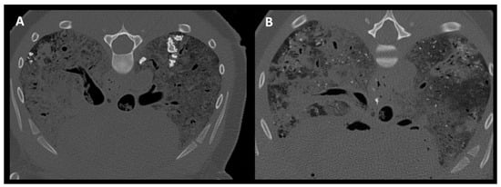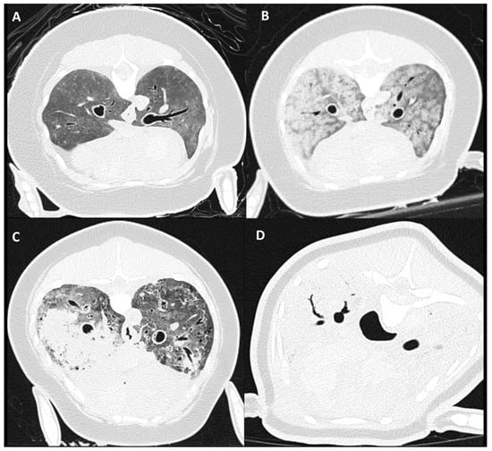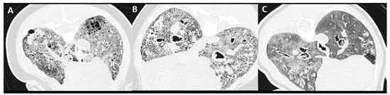Bronchial wall thickening (30/46) was one of the most reported findings on PMCT evaluation in the current study and was always seen in combination with pulmonary helminthiasis. Tracheobronchial helminths would likely act as an irritant on the respiratory epithelium, initiating an inflammatory reaction and mineralization of the wall tissue layers in a chronic phase, resulting in the visualized thickening of the walls. As bronchial wall thickness is more difficult to assess on conventional necropsy, this represents an important, potentially more quantitative evaluation of the lungs on PMCT imaging. Another potential sign of bronchial disease in this study was thought to be represented by the high presence of pulmonary air entrapment on PMCT images (33/46). These hypoattenuating pulmonary changes represented in different patterns (Figure 6), with medium to large, mainly peripherally located, thin-walled bullous-like lesions in the direction of the bronchi (Figure 6A), likely representing what has been described as saccular bronchiectasis []. In theory, pulmonary air entrapment, including intravascular gas attenuations, could also represent putrefaction gases [,,], bullous emphysematous changes (also called honeycombing pattern), secondary chronic obstructive and/or fibrotic pulmonary disease [,], subpleural emphysema, or decompression of supersaturated tissues secondary to the process of drowning/asphyxia at depth [,,].