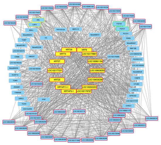 - Zhang, X.; Bao, P.; Ye, N.; Zhou, X.; Zhang, Y.; Liang, C.; Guo, X.; Chu, M.; Pei, J.; Yan, P. Identification of the Key Genes Associated with the Yak Hair Follicle Cycle. Genes 2021, 13, 32. [Google Scholar] [CrossRef]