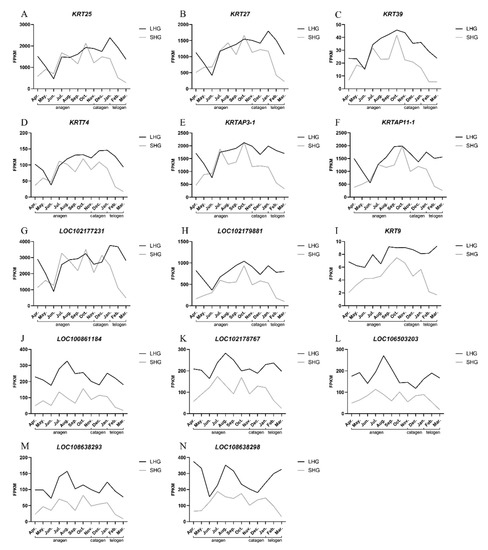 | LHG | KRT25 | 4.16 ± 1.68 | 5.42 ± 1.04 | 5.54 ± 1.52 | LOC102178767 | 6.63 ± 1.79 | 6.72 ± 1.25 | 9.14 ± 6.79 |