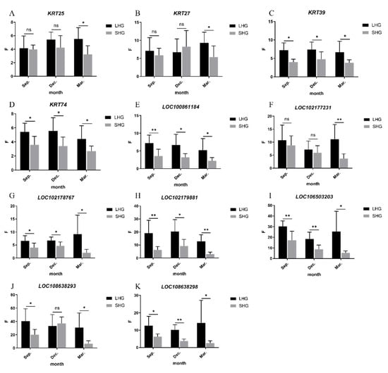 | LHG | KRT74 | 5.41 ± 1.14 | 5.54 ± 1.75 | 4.41 ± 1.73 | LOC108638293 | 40.52 ± 17.15 | 32.94 ± 16.17 | 30.71 ± 20.37 |