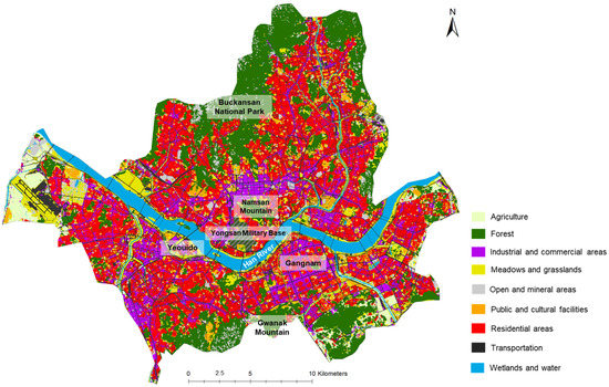 Land-use class of the city of Seoul (2017) and some major landmarks.