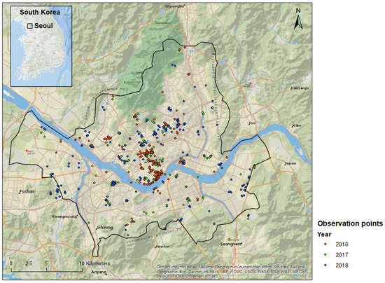 Although the pollinator citizen science project is open to the whole country, our analysis focused on Seoul, the capital of the Republic of Korea, because most of the observations were done in this area. Seoul spans approximately 38 km from north to south and 45 km from east to west (Figure 1). As one of the key global cities in Asia today and the economic heart of the country, it hosts 22% of the country’s firms and 20.6% of total employment [34]. Approximately ten million people are living in Seoul, making it one of the densest cities in the world with 16,000 people/km². Including the surrounding areas, the Seoul Metropolitan area holds 25 million people, half of the entire Korean population [34].