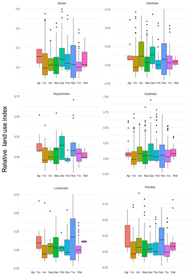 Regarding the land-use affinity of each family (Figure 3), most of them, particularly, Pieridae, Apidae, and Halictidae, showed an affinity for agricultural areas. On the other hand, forest areas appeared to be the ones with which most of the families had fewer affinities. It was particularly true for both of the Lepidoptera families, the Pieridae and Lycaenidae. Most of the families were also showing positive affinities with the open areas and more particularly the Apidae, Megachilidae, and the Halictidae families.