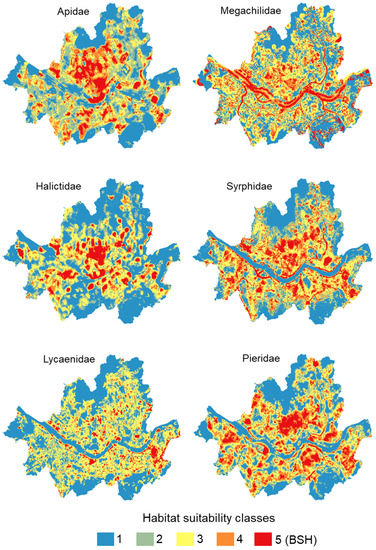 Estimated probability of observation of six families of pollinators in Seoul. For each family, the areas were ranked according to suitability classes ranging from 1 (blue areas, lowest probability of occurrence) to 5 (red areas, highest probability of occurrence, called in the manuscript “Best suitable habitats”, BSH).