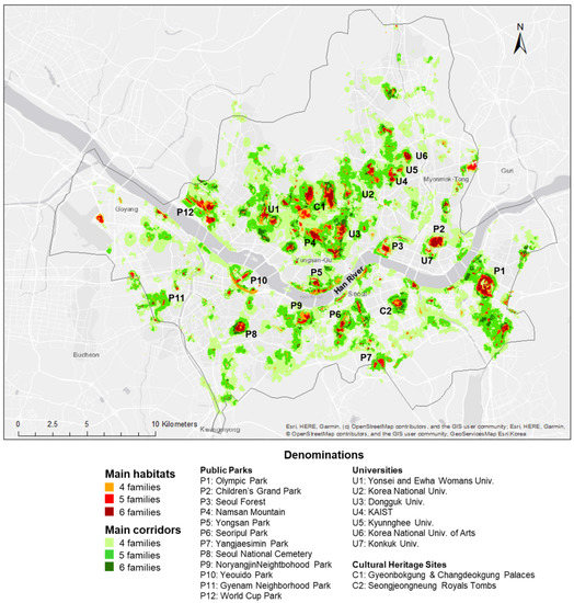 Main habitats (Figure 5, orange to dark red) represent 2145 ha in Seoul or 3.7% of the city area. They are slightly more numerous in the north than on the south side of the Han River. Two Cultural Heritage Sites corresponding to historical palaces (in the northern part of Seoul) and royal tombs preserved in a forested park (southeast part of Seoul) also constituted some of the multi-family habitats.