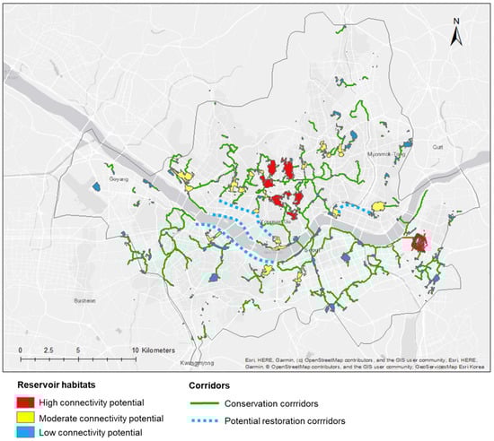 To maintain or enhance connectivity for pollinators in Seoul, we identified “conservation corridors”, i.e., corridors that must be maintained and reinforced because of their high contribution to current connectivity. We also identified by visual analysis some “Potential restoration corridors”, i.e., where restoration actions could be done between habitat patches with moderate to high contribution to connecting patches that are not connected yet. This approach examines the potential restoration corridors and does not take into account economic, social nor political issues associated with restoration.