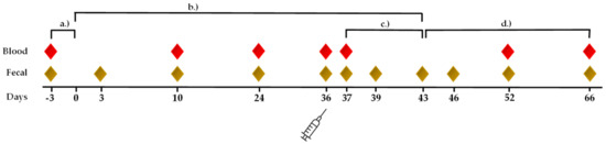 Timeline and sampling days of the trial. Blood samples (red diamond) and fecal samples (brown diamond) were collected on the indicated days. (a) day −3 to 0 before supplementation. (b) day 1–43, the horses received the SCF product (OLI, n = 6) or a placebo (PLA, n = 5) during supplementation. (c) day 37–43 after vaccination. (d) day 43–66, the horses received no supplementation (after supplementation period). On day 36, the horses were vaccinated parenterally against equine influenza.