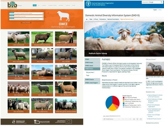 Figure 2. NRIAP biodiversity website-native breeds of sheep in Poland (http://owce.bioroznorodnosc.izoo.krakow.pl/, accessed on 1 March 2022) and Polish EFABIS website (https://www.fao.org/dad-is/regional-national-nodes/efabis-pol/en/, accessed on 1 March 2022). - -