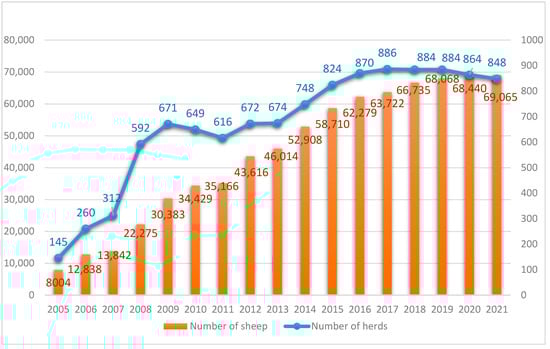 The programme for the conservation of genetic resources in sheep has been a useful tool to protect the biodiversity of this species. Since the beginning of the programme for the conservation of sheep genetic resources, there has been a steady increase in the protected population. Within 15 years of the implementation of the programme (Figure 3), the number of sheep increased over eightfold: from eight thousand ewes in 2005 to over sixty-nine thousand in 2021, kept in 848 flocks all over Poland. Since 2008 and the inclusion of the Old-type Polish Merino Sheep in the conservation programme along with the Podhale Zackel, there has been a significant, almost twofold increase in the number of flocks in comparison to the number recorded in the previous year. This was due to the more numerous initial populations of these two sheep breeds. In 2015, two other breeds were included in the conservation programme: Polish Pogórza sheep and Black-headed sheep. With much smaller populations, therefore, the increase in their numbers was not so rapid. The dynamics of activities related to the implementation of protection programmes have had and still have an impact on sheep breeding in Poland. Due to the possibility of obtaining subsidies for animals covered by the protection programme, breeders are more willing to keep native breeds, for which subsidies were provided, than other breeds of sheep. The native breeds of sheep continue to expand, but these changes are occurring within existing herds. Therefore, the number of herds has started to stabilize in recent years. In 2005, ewes covered by the genetic resources protection programme made up 8% of the total population of ewes entered in the books, while in 2020 they accounted for 80% [11,15,16].