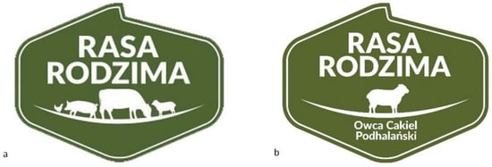 Considering the valuable properties of raw materials and products derived from local breeds, efforts have been made in many European countries to promote them through certification with unique quality marks. The NRIAP develops a certification system for native breeds and their products. As part of the project “Directions of use and protection of animal genetic resources under the conditions of sustainable development”, the Native Breed logo was developed as a collective symbol (Figure 5), as well as a separate one for each native breed, providing the basis for promotion of livestock native breeds as well as raw materials and products derived from them (http://ksb.izoo.krakow.pl/site/certification, accessed on 1 March 2022).
