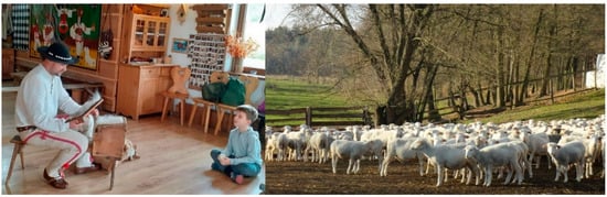 Keeping native breeds is popular among organic and farm-tourism farms, where they play an important popularising, promotional, and educational role not only for the animals themselves, but also for the region they come from (Figure 6). Such farms, often located within tourist-friendly regions with hiking and cycling trails, offer accommodation and facilities for many age groups, food produced by the farm, which is natural and minimally processed, as well as direct contact with animals and nature. Due to their good adaptation to local conditions, resistance to disease, healthiness and longevity, native breeds of animals are particularly useful in farm tourism, which is an essential element in protecting biodiversity [11,17]. An example of combining ecological and farm tourism activities is the certified “Nad Pilicą” Farm, located in the village of Krzętów in the Przedbork Landscape Park. The farm keeps sheep of the Świniarka breed, which is the native, most primitive breed of sheep in Poland. Visitors to the farm can learn about local customs and take part in activities and workshops on cultivating traditions, such as making cheese from sheep’s milk or sheep wool products—felting [24].