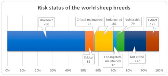 Sheep, apart from cattle and horses, are the species with the largest number of endangered breeds (n = 181) (Figure 8); a large number of extinct sheep breeds have also been reported (n = 129). The species with the largest number of breeds (n = 183) reported as extinct are cattle, as well as pigs (n = 93) and horses (n = 92); some breeds may have become extinct before they were documented [3]. The status of many sheep breeds is unknown (n = 780), so it is important to continuously monitor the status of endangered species in order to implement appropriate conservation mechanisms to save valuable genotypes.
