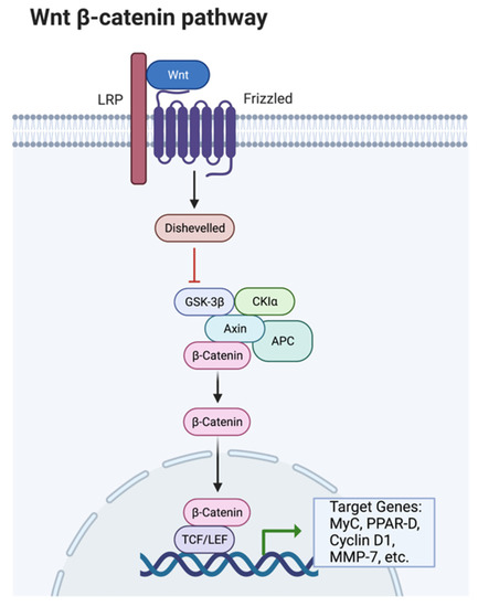 The Wnt/β-catenin pathway. Produced in biorender and adapted from cellsignal.com, accessed on 13 June 2022.