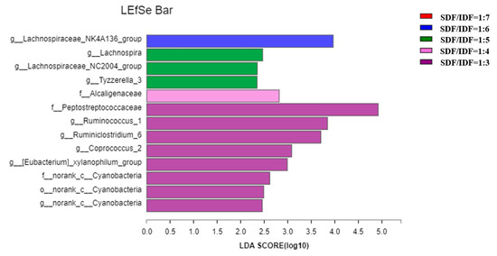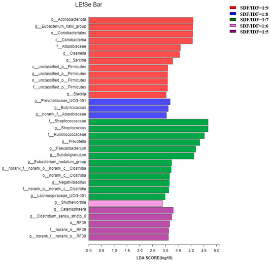 Effects of SDF to IDF ratio on fecal microbiota of growing-finishing pigs. The abundances of different bacteria were classified using the linear discriminant analysis (LDA) effect size algorithm if the logarithmic LDA values of bacteria exceeded 2.0. Differences were considered significant if p < 0.05. n = 6. SDF, soluble dietary fiber; IDF, insoluble dietary fiber.