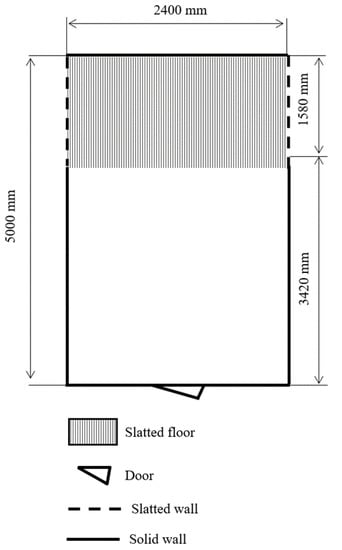 - Aarnink, A.J.A.; van den Berg, A.J.; Keen, A.; Hoeksma, P.; Verstegen, M.W.A. Effect of slatted floor area on ammonia emission and on the excretory and lying behaviour of growing pigs. J. Agri. Eng. Res 1996, 64, 299–310. [Google Scholar] [CrossRef]