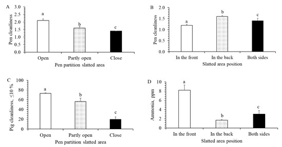 Effects of pen design on pen and pig cleanliness and ammonia concentration. (A) Pen cleanliness and pen partition of slatted floor (F3472 = 3.8; p = 0.010). (B) Pen cleanliness and slatted area position (F3472 = 5.3; p < 0.010). (C) Pig cleanliness and pen partition slatted area (F3472 = 4.1; p = 0.007). (D) Ammonia concentration and slatted area position (F3472 = 4.3; p = 0.008). a, b, c = means with different superscripts are significantly different (p < 0.05).