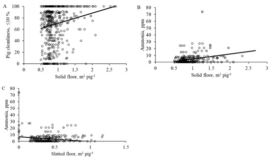Effect of pen size on pig cleanliness and ammonia concentration. (A) Pig cleanliness and solid floor area per pig (F1472 = 19.7; p < 0.001). (B) Ammonia concentration and solid floor area (F1472 = 69.3; p < 0.001). (C) Ammonia concentration and slatted floor area (F1472 = 100.3; p < 0.001).