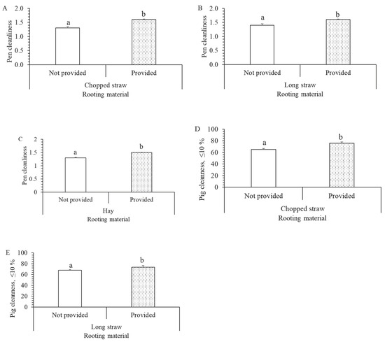 Effect of different rooting materials on pen, pig cleanliness and ammonia concentration. (A) Pen cleanliness and chopped straw (F1472 = 5.8; p = 0.017). (B) Pen cleanliness and long straw (F1472 = 9.6; p = 0.002). (C) Pen cleanliness and hay (F1472 = 4.5; p = 0.035). (D) Pig cleanliness and chopped straw (F1472 = 4.9; p = 0.028). (E) Pig cleanliness and long straw (F1472 = 4.3; p = 0.038). a, b = means with different superscripts are significantly different (p < 0.05).