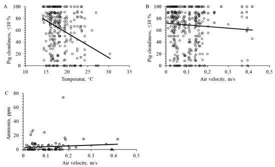 Effect of ambient temperature and air velocity on pen and pig cleanliness, and ammonia concentration. (A) Pig cleanliness and temperature (F1472 = 28.9; p < 0.001). (B) Pig cleanliness and air velocity (F1472 = 8.8; p = 0.003). (C) Ammonia concentration and air velocity (F1472 = 115.2; p < 0.001).