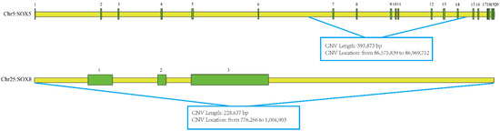 The CNV (chr5: 86,575,839 to 86,969,712) of SOX5 (AC_000162.1) is located in intron 6–14. The CNV (chr25: 776,266 to 1,004,903) contains the entire gene sequence of SOX8 (AC_000182.1) (Figure 1).