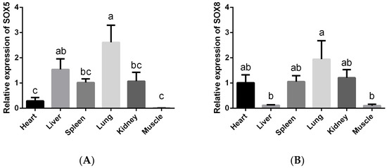 Gene expression of SOX5 and SOX8 in different tissues. (A) SOX5 expression in different tissues, and (B) SOX8 expression in different tissues. a, b, and c denote significant at p < 0.05.