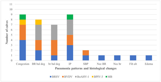 Relationship between pneumonic patterns and histological changes with the associated infected agent identified by immunohistochemistry in the lungs of aborted bovine fetuses. Footnote: BoAHV1: bovine alphaherpesvirus 1; BPIV-3: bovine parainfluenza virus 3; BRSV: bovine respiratory syncytial virus; BVDV: bovine viral diarrhea virus; M. bovis: Mycoplasma bovis. IP, interstitial pneumonia; BR bal deg, bronchial epithelial ballooning degeneration; SBP, suppurative bronchopneumonia; br bal deg, bronchiolar epithelial ballooning degeneration; BR nec, bronchial epithelial necrosis; br nec, bronchiolar epithelial necrosis; Fib Alt, fibrinoid alteration.