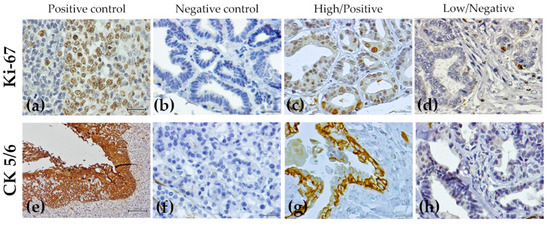 Cellular proliferation is an integrant part of tumor development and several studies have investigated the expression of proliferation markers in preneoplastic and precancerous lesions [35,36,37]. Among these markers, Ki-67 has been associated with the worst prognosis in both HBC and feline mammary carcinomas [17,38,39]. Likewise, patients with mammary tumors that express basal-type cytokeratins (CK), such as 5 and 6, have been shown to have a poorer prognosis [40].
