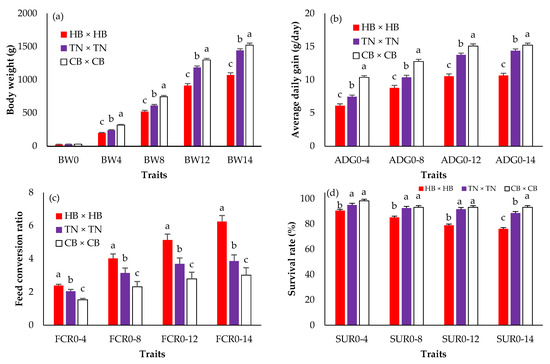 The least squares means (standard error) of the body weight (a); average daily gain (b); feed conversion ratio (c); survival rate (d) in purebred black-bone and Thai native chickens; a, b, c: Means for the trait with different letters differ significantly at p < 0.05; HB × HB—purebred Hmong black-bone chicken (red bar); TN × TN—purebred Thai native chicken (purple bar); CB × CB—purebred Chinese black-bone chicken (white bar); BW0—birth weight (g); BW4, BW4, BW8, BW12, BW14—birth weight and body weight at 4, 8, 12, 14 (slaughtering weight) weeks of age (g); ADG0–4, ADG0–8, ADG0–12, ADG0–14—average daily gain during 0–4, 0–8, 0–12, 0–14 weeks of age (g/day); FCR0–4, FCR0–8, FCR0–12, FCR0–14—feed conversion ratio during 0–4, 0–8, 0–12, 0–14 weeks of age; SUR0–4, SUR0–8, SUR0–12, SUR0–14—survival rate during 0–4, 0–8, 0–12, 0–14 weeks of age (%).