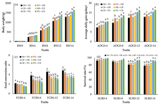 Least squares means (standard error) of body weight (a); average daily gain (b); feed conversion ratio (c); survival rate (d) in purebred black-bone and Thai native chickens; a, b, c, d: Means for the trait with different letters differ significantly at p < 0.05; HB × TN—crossbred chicken between Hmong black-bone chicken (used as chicken cocks) and Thai native chicken (used as chicken hens) (black bar); TN × HB—crossbred chicken between Thai native chicken (used as chicken cocks) and Hmong black-bone chicken (used as chicken hens) (orange bar); CB × HB—crossbred chicken between Chinese black-bone chicken (used as chicken cocks) and Hmong black-bone chicken (used as chicken hens) (gray bar); HB × CB—crossbred chicken between Hmong black-bone chicken (used as chicken cocks) and Chinese black-bone chicken (used as chicken hens) (yellow bar); CB × TN—crossbred chicken between Chinese black-bone chicken (used as chicken cocks) and Thai native chicken (used as chicken hens) (blue bar); TN × CB—crossbred chicken between Thai native chicken (used as chicken cocks) and Chinese black-bone chicken (used as chicken hens) (green bar); BW0—birth weight (g); BW4, BW4, BW8, BW12, BW14—birth weight and body weight at 4, 8, 12, 14 (slaughtering weight) weeks of age (g); ADG0–4, ADG0–8, ADG0–12, ADG0–14—average daily gain during 0–4, 0–8, 0–12, 0–14 weeks of age (g/day); FCR0–4, FCR0–8, FCR0–12, FCR0–14—feed conversion ratio during 0–4, 0–8, 0–12, 0–14 weeks of age; SUR0–4, SUR0–8, SUR0–12, SUR0–14—survival rate during 0–4, 0–8, 0–12, 0–14 weeks of age (%).