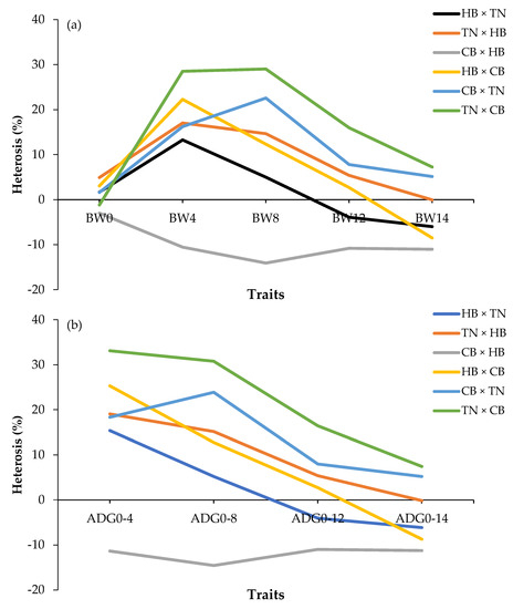 The percentage of heterosis for BW and ADG is shown in Figure 3. For the body weight trait (Figure 3a), the positive values at BW4, BW8, and BW12 in the crossbreeds were TN × CB (green line), CB × TN (blue line), TN × HB (orange line), and HB × CB (yellow line). However, the value was negative at all weeks of age in CB × HB (gray line), at BW12 in HB ×TN (black line), and BW14 in HB × CB (yellow line) (p < 0.05). For the ADG traits, Figure 3b shows that all crossbreeds decreased with increasing age. TN × CB (green line), CB × TN (blue line), and TN × HB (orange line) were positive values at all ages. However, CB × HB (gray line) was negative at all weeks of age (p < 0.05).