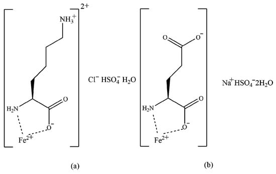 Iron chelates with lysine and glutamic acid (Fe-LG) were provided by Zinpro Animal Nutrition Technology Co., Ltd. (Shanghai, China). The active substrate is divalent Fe in the form of chelates of lysine and glutamic acid in a 1:1 mixture The structure formulas are presented in Figure 1. The chemical formulas of the two compounds are C6H17ClFeN2O7S (a) and C5H12FeNNaO10S (b), respectively [18]. The analyzed content of Fe was 154.2 g/kg.