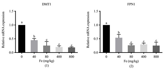 Supplementation with different levels of Fe significantly downregulated DMT1 and FPN1 in the duodenum of 42-day-old broilers compared with the levels in the control group (p < 0.05; Figure 2). An increase in the dose of supplemental Fe contributed to a reduction in the mRNA expression of the two transporters, with significant differences between groups which were administered the higher doses (400 and 800 mg Fe/kg) and the lower dose (40 mg Fe/kg) (p < 0.05), respectively.