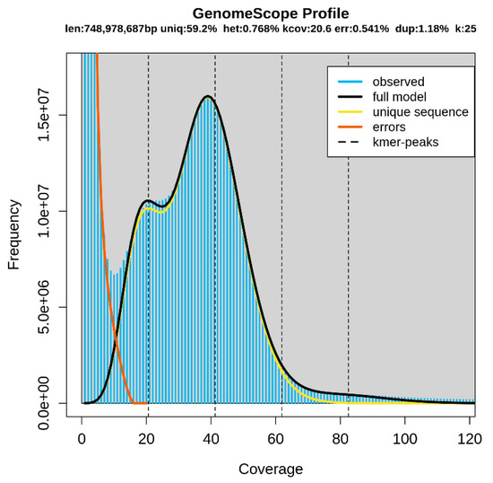 - Vurture, G.W.; Sedlazeck, F.J.; Nattestad, M.; Underwood, C.J.; Fang, H.; Gurtowski, J.; Schatz, M.C. GenomeScope: Fast reference-free genome profiling from short reads. Bioinformatics 2017, 33, 2202–2204. [Google Scholar] [CrossRef] [PubMed]
