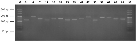 A total of 4,447,517 microsatellite motifs were identified from the genome survey assembly of Patagonian moray cod. The types of the motifs were dinucleotide, trinucleotide, tetranucleotide, and pentanucleotide, with the fractions of 77.40% (3,430,720), 17.89% (793,122), 3.97% (175,791), and 0.74% (21,801), respectively (Table 4). The most frequent dinucleotide motif was found to be AC/GT (61.21%), followed by AG/CT (24.80%), AT/AT (13.83%), and CG/CG (0.16%). The most abundant trinucleotide motif was found to be AGG/CCT (29.04%), followed by AAT/ATT (18.99%), ACC/GGT (14.34%), AAC/GTT (9.62%), AAG/CTT (9.03%), ATC/GAT (6.49%), AGC/GCT (5.24%), ACT/AGT (3.89%), CCG/CGG (2.69%), and ACG/CGT (0.67%). Regarding the tetranucleotide and pentanucleotide motifs, the most frequent motifs were ACAG/CTGT (27.78%) and AGAGG/CCTCT (32.37%), respectively (Table 4). To compare the microsatellite motifs of Patagonian moray cod with other species, the microsatellite motif analysis results of Trematomus loennbergii and Pogonophryne albipinna were used [22,23]. When comparing the number of microsatellites, Patagonian moray cod had the most SSRs, and there was no significant difference in the number of SSRs between T. loennbergii and P. albipinna. When comparing the repeat type, it was confirmed that the ratio of trinucleotides was slightly higher in Patagonian moray cod than in other species. Additionally, unlike other species, Patagonian moray cod did not have a hexanucleotide type (Table S1). Based on the microsatellite motif analysis and the parameters of the QDD pipeline, 83 primer pairs were selected (Table S2). To ensure the usability of these microsatellite markers, 25 primer pairs were randomly selected and used for PCR with the genomic DNA of Patagonian moray cod. Consequently, 15 primer pairs were observed to yield only a single band (Figure 2).