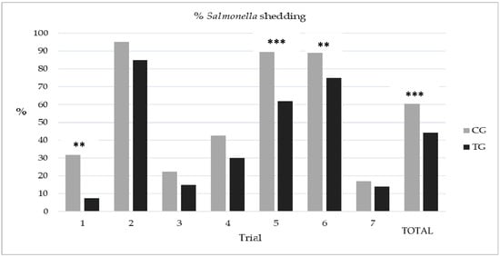 Proportion of Salmonella shedding at slaughter in the seven trials and globally. Significant differences between the control (CG) and the treated group (TG) are indicated (** p < 0.05; *** p < 0.01; Fisher´s exact test).