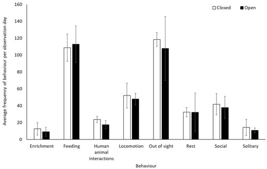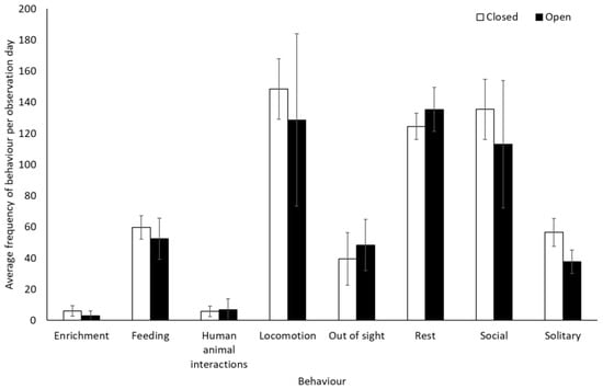 An overview of mean frequency of chimpanzee behaviour during closure and reopening observation periods. Error bars represent standard deviation.