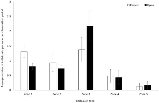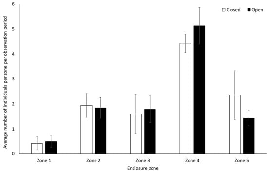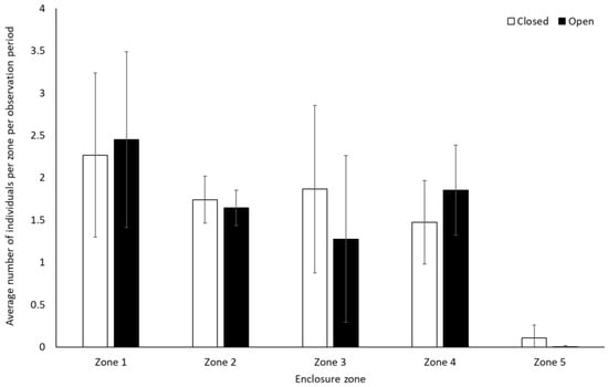 Average number of bonobos per enclosure zone per observation period. Error bars represent standard deviation.