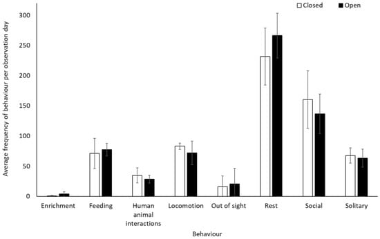 Olive baboons also displayed some behavioural changes, with increased human–animal interactions (number of vehicle contacts during the observation) and decreased performance of sexual behaviours when the safari park was open. In wild baboons, mating patterns are varied, but generally, sexual behaviours only occur in the initial stages of a sexual swelling or during maximum tumescence indicative of ovulation [57]. Females produce acoustic and olfactory signals when fertile, and therefore sexual occurrences rarely occur outside of ovulation [58,59]. Due to the size of the baboon troop at Knowsley Safari it is estimated that there are usually approximately 20 females in oestrus at any one time, with higher-ranking females becoming pregnant immediately post-nursing, rather than individuals falling into specific breeding cycles as is more commonly observed in the wild. Anecdotally, keepers attributed the increased sexual behaviour to an increase in imitation behaviour being performed by the juvenile members of the troop when they did not have the alternative stimulation from the presence of moving vehicles in their enclosure (Davies Walsh & Armstrong, pers comm).