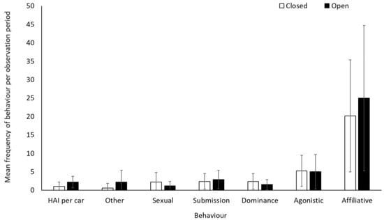 There was no significant difference in frequency of affiliative, agonistic, and submissive behaviours for the olive baboons when the safari park was open or closed to visitors (p > 0.05, Table S2). Dominance (−0.5437 ± 0.1972, Z = −2.757, p = 0.006) and sexual behaviour (−0.6980 ± 0.2349, Z = −2.971, p = 0.003) were lower when the safari park was open than when closed. Human–animal interactions (number of vehicle contacts) were more frequent when open (exposed to visitors’ cars and the ranger’s vehicle) than when closed (exposed only to the ranger’s vehicle) (1.824 ± 0.201, Z = 9.093, p < 0.001), as were “other” behaviours (1.4436 ± 0.4551, Z = 3.172, p = 0.002) (Figure 7). Average rates (mean ± SD) of human–animal interactions per car were 4.6 ± 5.7 and 6.9 ± 3.9 when the facility was closed and open, respectively.