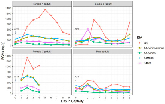 The possums involved in the ACTH challenge were exposed to both a natural stressor (capture and captivity) and a synthetic stressor (injection of exogenous ACTH) concurrently. Natural stressors are known to increase FGMs in wildlife, for example, following isolation and movement, baseline corticosterone of tammar wallabies (Notamacropus eugenii) increased by between 59% and 226% [67], and FGMs in Western lowland gorillas (Gorilla gorilla gorilla) increased in response to relocation, health checks, and introduction to other animals [68]. Possums were therefore expected to experience a significant increase in circulating glucocorticoids soon after capture and injection and the resulting peak in FGMs would be an indication of the excretion lag time (as injection of ACTH occurred minutes after capture), although a higher sampling frequency would be required to calculate an exact lag time.