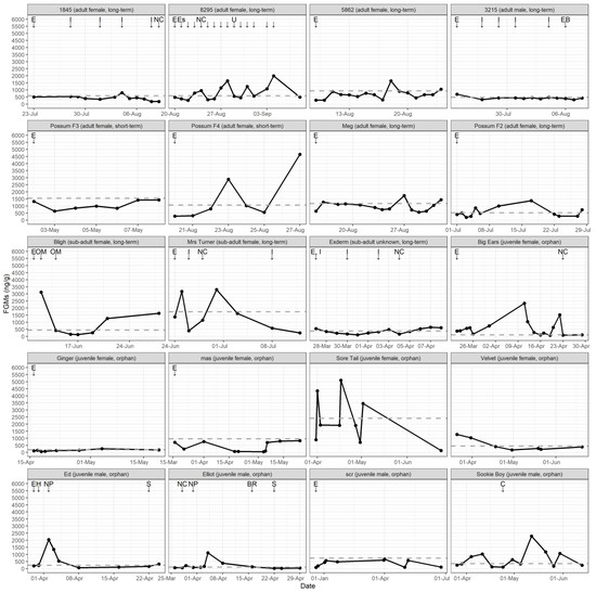 Faecal glucocorticoid metabolite (FGM) concentrations (ng/g) for 20 possums during rehabilitation. Potential stress events are represented as arrows, indicating when they occurred relative to sample collection (E = Enter rehabilitation; C = No cover; NC = New cage; NP = New possum; BR = Back rider; H = Handling; S = Separated; I = Injection; OM = Oral medication; EB = excited behaviour and movements; Es = escaped cage; U = a lot of urine noticed in cage; possum 8295 received daily oral medication in addition to labelled events). The grey dashed line represents the baseline threshold above which values are classified as peaks.