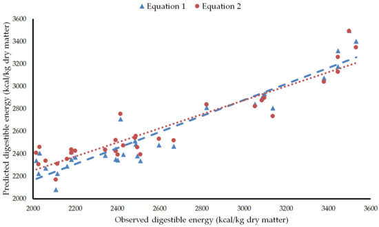 Equations (1) and (2) have the same structure. Both are summative equations that result from adding the equations for the prediction of the digestible energy supplied by each digestible nutrient into a single equation [35]. An important difference between Equations (1) and (2) is that crude fiber has a negative contribution to digestible energy in the former but a positive contribution in the latter. This difference is due to the fact that the crude fiber term derives from the equation for the calculation of digestible energy provided by crude fiber (positive contribution) and from the equation for the calculation of digestible energy provided by nitrogen-free extract (negative effect of a higher magnitude of crude fiber) in Equation (1) [8].