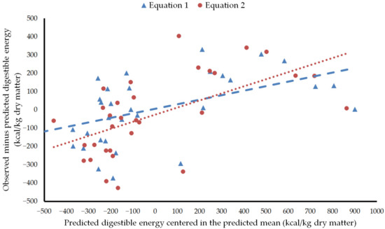 Evaluation showed that Equation (1) had high precision (R2 = 0.89), accuracy (RMSEP = 183 kcal/kg dry matter or 7.1% of the observed mean), and reproducibility (CCC = 0.91) (Figure 1). Equation (2) performed slightly worst (R2 = 0.87, RMSEP = 217 kcal/kg dry matter or 8.4% of the observed mean, and CCC = 0.86) (Figure 1). The regression of the residuals on the predicted digestible energy values centered in the predicted mean showed that no equation had mean bias (intercept p > 0.05), whereas linear bias was significant in both of them (slope p < 0.01) (Figure 2). Central tendency error, linear error, and random error accounted for 0.09, 24.56, and 75.35% of MSEP, respectively, in Equation (1), while they represented 1.52, 33.63, and 64.86% of MSEP, respectively, in Equation (2). Both equations overvalued mixed feeds and diets with low digestible energy and undervalued mixed feeds and diets with high digestible energy, although the error was higher with Equation (2). In the six mixed feeds and diets with observed digestible energy beyond one standard deviation under the mean, overprediction was 9.7 ± 6.5% and 13.3 ± 6.1% with Equations (1) and (2), respectively. In the eight mixed feeds and diets with observed digestible energy beyond one standard deviation over the mean, underprediction was 6.2 ± 3.5% and 7.7 ± 4.1% with Equations (1) and (2), respectively. Zeyner and Kienzle [14] recognized that their equation would underestimate digestible energy in diets with more than 5% fat or rich in highly fermentable fiber. However, only one mixed feed beyond one standard deviation over the mean had more than 5% fat (No. 27 in Table 1) or would be expected to contain a high proportion of highly fermentable fiber (No. 27 and 28 in Table 1, i.e., Compound feeds 21 and 23 of Smolders et al. [26]).