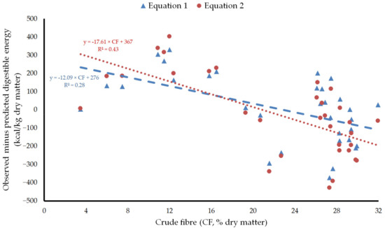 Due to the close relationship between gross energy digestibility, organic matter digestibility, and crude fiber in horse feeds [7,38,39], crude fiber might be responsible for the linear bias in the predictions of digestible energy by both equations. This would be supported by the fact that the residuals were negatively correlated with crude fiber (r = −0.53 and p < 0.01 in Equation (1), and r = −0.66 and p < 0.001 in Equation (2); Figure 3), i.e., the lower the crude fiber content in the feed, the higher the underestimation of its digestible energy value, and the higher the crude fiber content in the feed the higher the overestimation of its digestible energy value. The equations used by Núñez-Sánchez et al. [8] to derive digestible contents of crude protein and crude fat in ingredients did not take into account any possible negative effect of crude fiber on the digestion of those proximate components. Zeyner and Kienzle [14] arbitrarily set the contribution of digestible crude fiber to digestible energy to a value 5.33 times lower than expected from its heat of combustion to account for any negative effects of crude fiber on the digestion of the other proximate components. Owens et al. [30] showed that crude fiber increases the fecal losses of crude protein, crude fat, and nitrogen-free extract and thus decreases the digestible energy value of feedstuffs in ruminants. The same might be true in horses. The high and negative correlations found in the dataset used in the present work (Table 1) between crude fiber and digestible crude protein, digestible nitrogen-free extract, and digestible crude fat (r = −0.91, −0.83, and −0.87, respectively; p < 0.001) would indicate that any negative effects of crude fiber on the digestibility of each of the other proximate components, as done only for nitrogen-free extract in Núñez-Sánchez et al. [8], should be considered in Equations (1) and (2) in order to improve their accuracy.
